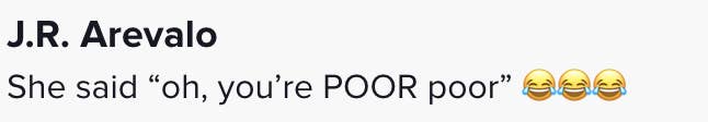 One more joked: “She said ‘oh, you’re POOR poor’ 😂😂😂”