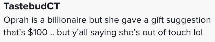 “Oprah is a billionaire but she gave a gift suggestion that’s $100 .. but y’all saying she’s out of touch lol,” one person wrote. Another reasoned: “shes thinking on her feet here not prepared for this question so, I think she did alright.”