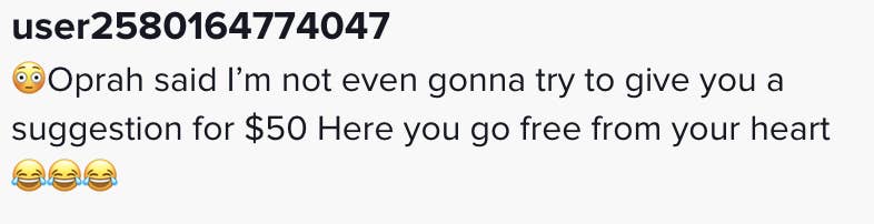 “😳Oprah said I’m not even gonna try to give you a suggestion for $50 Here you go free from your heart😂😂😂,” one more added. Another echoed: “She said.. if you cant afford $100.. just stick to a pen and paper lol.”