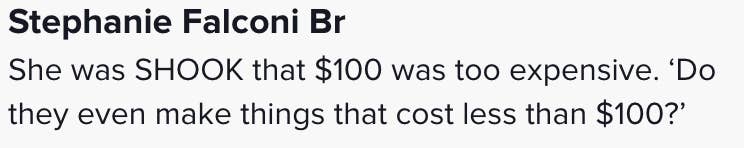 “The judgement when he said $100 was too expensive,” one amused TikTok user commented. Another joked: “She was SHOOK that $100 was too expensive. ‘Do they even make things that cost less than $100?’”
